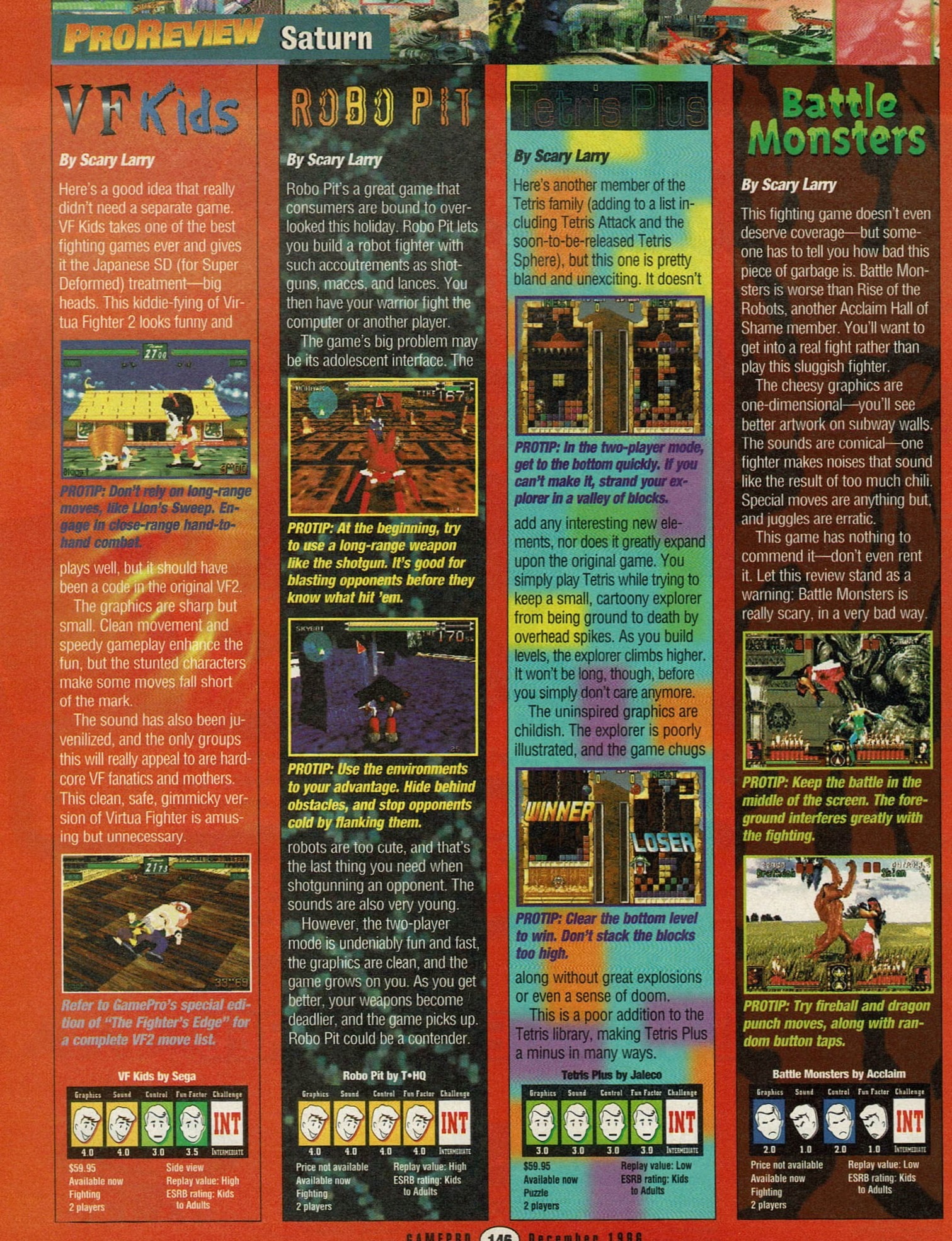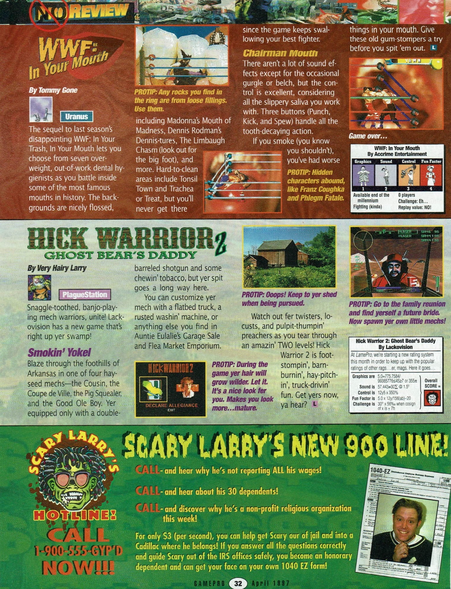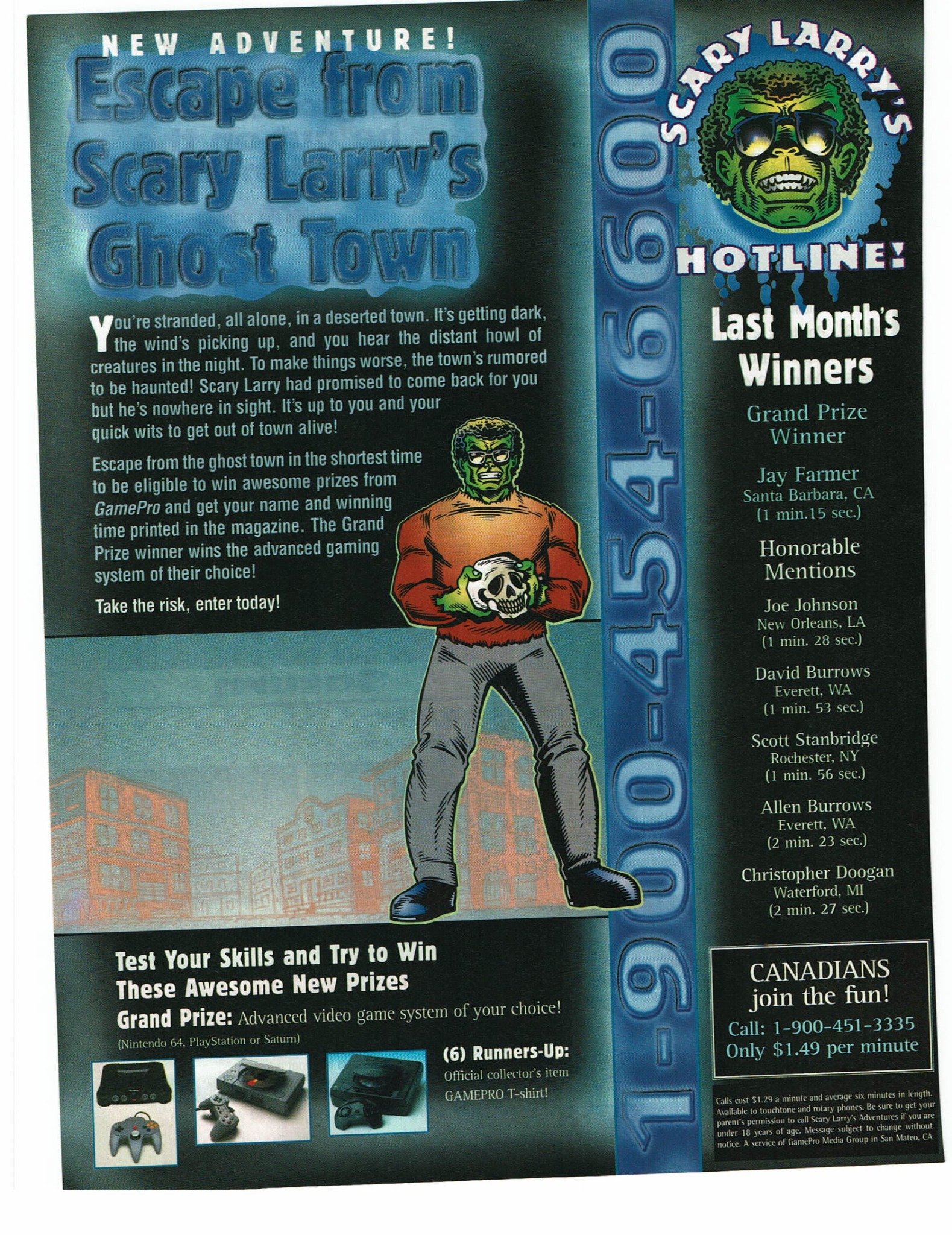 I worked at IDG Publishing for GamePro Magazine for almost ten years. It was the most prolific writing I have ever done. I wrote over 2000 articles in the ten years I was there - everything form reviews to features to news announcements to interviews. This was my most creative period, and the lessons I learned from an unbelievably talented group of editors, copy editors and designers helped launch all my subsequent careers. I wrote under the pseudonym Scary Larry. Clicking on the image will reveal some explanatory text about each image.